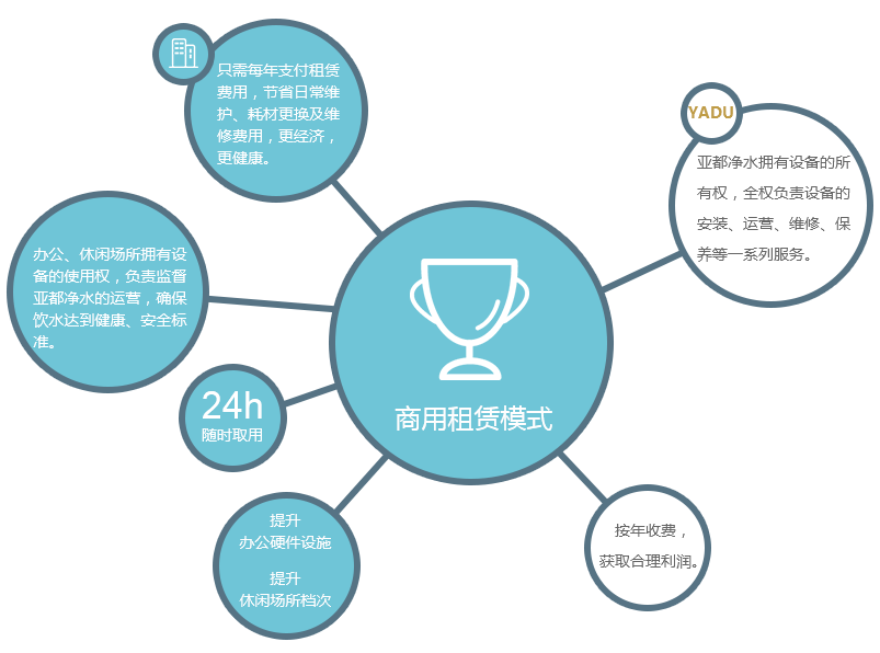 办公、休闲场所无需负担设备的滤芯更换、维护、维修费用,只需每年支付固定的租赁费用,可为企业节省50%的饮水费用,与其它饮水方式相比更经济,更健康。